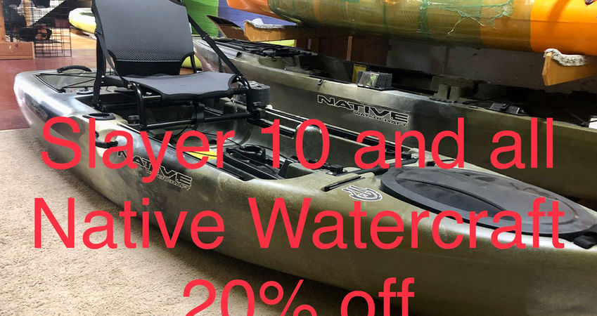 • Native Watercraft Slayer Propel 10 pedal kayaks are 20% off. We also have one Slayer Propel 12.5 MAX, and a Titan 10.5 on sale. Most of these are Hidden Oak for color. Call or stop in the store for specific details.